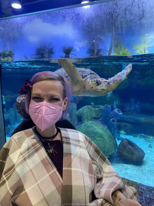 This page contains 4 photos of Allie, a white female with pink and blue hair, sitting in her wheelchair and smiling at various events including: in front of a sea turtle at the Oklahoma aquarium, also at a CureSMA conference, also at Disneyland, also at a vocal performance rehearsal.