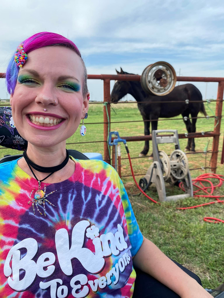 Allie, a white female with pink, blue and purple hair smiles as she sits in her wheelchair in front of a horse behind its fence.